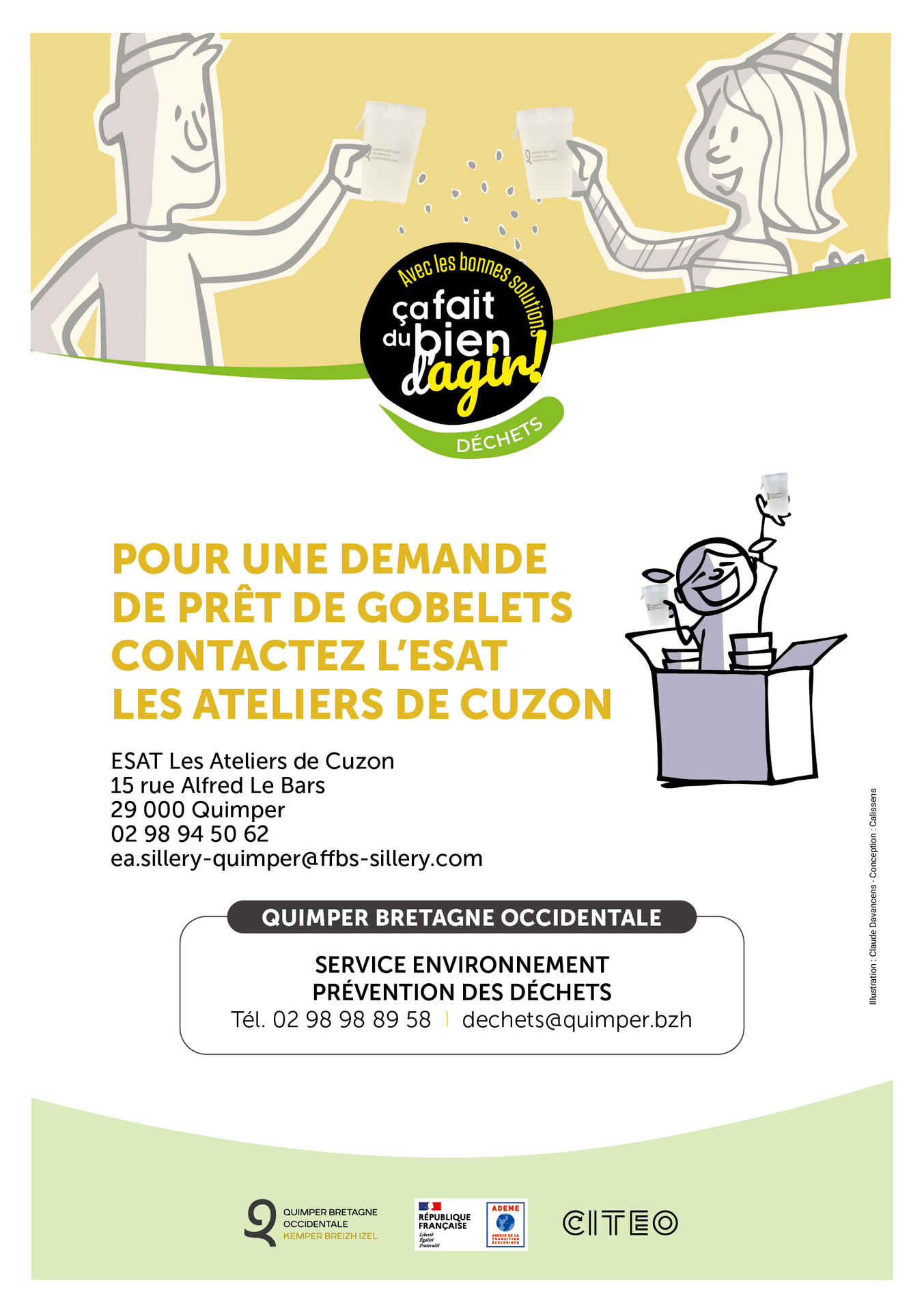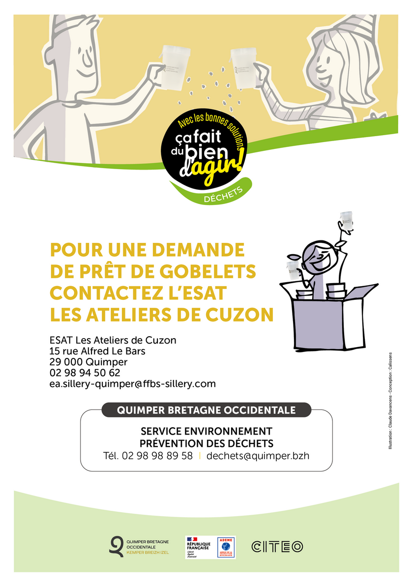Pour que les gobelets ne finissent plus leur vie dans les poubelles, les caniveaux ou la nature, Quimper Bretagne Occidentale met à disposition des organisateurs d’événements (concerts, spectacles, soirées privées, etc.) des gobelets réutilisables. Plus solides et plus durables, les gobelets réutilisables réduisent la production de déchets. Une fois lavés et séchés, ils sont remis à disposition. C'est tout bénéfice pour l'environnement… Et si vous ramenez tous les gobelets empruntés rincés, et en bon état, Quimper Bretagne Occidentale prend en charge le prix de la location et du lavage. Quimper Bretagne Occidentale fait appel à prestataire, les ATELIERS de CUZON - EA SILLERY-QUIMPER, une entreprise adaptée qui emploie des personnes en situation de handicap psy-chique dans des conditions adaptées à leurs possibilités.