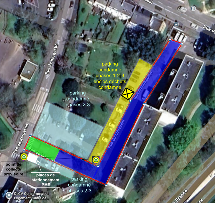Le point de collecte des déchets est déplacé provisionnement le temps des travaux au début de la rue du Limousin, au croisement avec la rue de Kergestin.