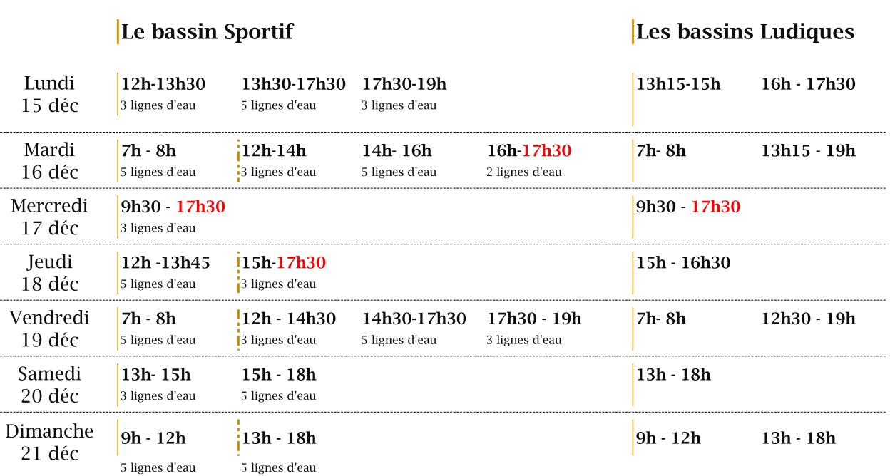 Piscine AquariveLa piscine de Kerlann Vihan sera fermée du 15 décembre au 4 janvier inclus afin d’assurer la finalisation des travaux de réhabilitation de la piscine réalisés cette année. Par conséquent, les horaires de la piscine Aquarive seront modifiés du 15 au 21 décembre pour permettre d’accueillir les clubs :