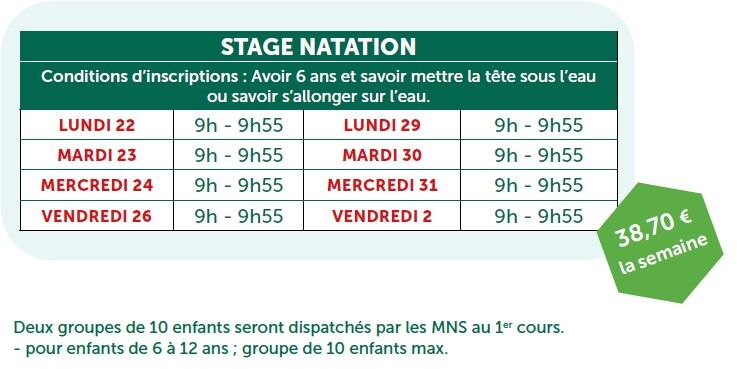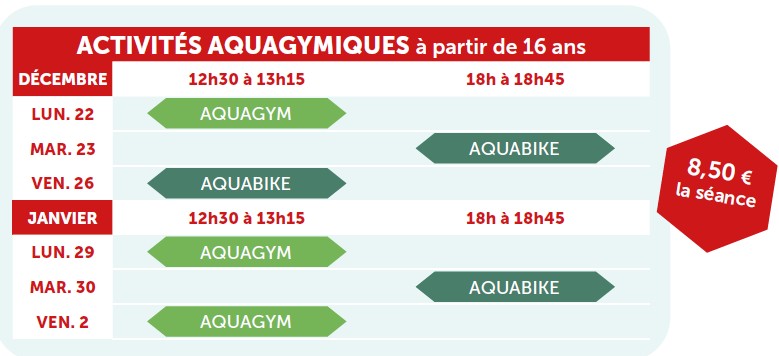 Retrouvez aussi le programme des activités aquagymiques et les stages de natation pendant les vacances.