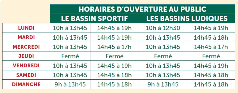 Dernier accès 45 min avant la fermeture. Évacuation bassins 15 min avant la fermeture