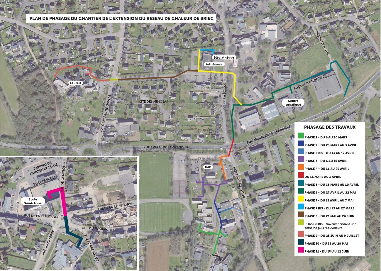 Le chantier de l’extension du réseau de chaleur de Briec sera réalisé en plusieurs phases, en fonction des contraintes de voirie et des secteurs concernés. Le chantier de pose de nouvelles canalisations débutera à compter du 29 avril prochain dans sa partie impactant la circulation et l’espace public.