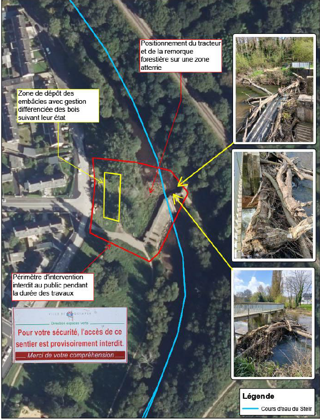 La passerelle en bois composite appartenant à la ville de Quimper bloquée dans l’ouvrage, sera également récupérée pour être remise en place par les services de la ville.