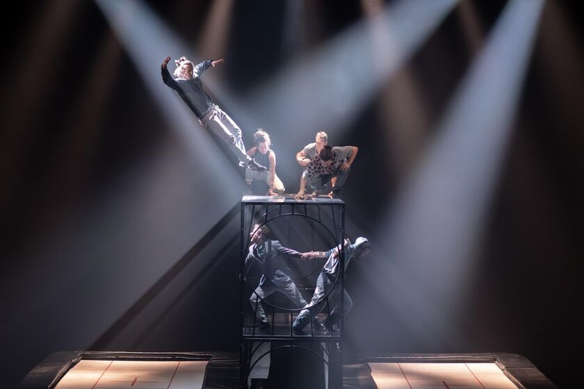 Une haute muraille de métal et de plexiglass entourée par deux trampolines. Cette structure mobile devient le terrain de jeu pour six acrobates spécialistes de l'envol et de la chute. Une bande-son immersive accompagne chaque tableau de ce ballet aérien hypnotique.