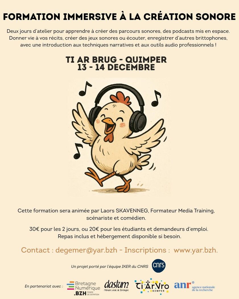 Plongez dans la création sonore en breton les 13 et 14 décembre à Ti ar Brug Quimper avec Laors Skavenneg. Apprenez récit audio, enregistrement et montage, et réalisez votre propre création sonore. Inscriptions obligatoires, venez créer et partager.