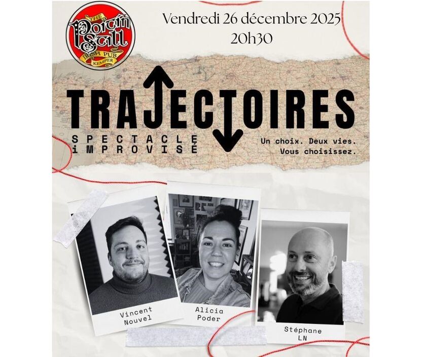 Trajectoires : un choix, deux vies. Deux trajectoires. Deux réalités parallèles. Un simple choix peut tout changer. Improvisé de bout en bout, Trajectoires vous invite à plonger dans le vertige de nos possibles.