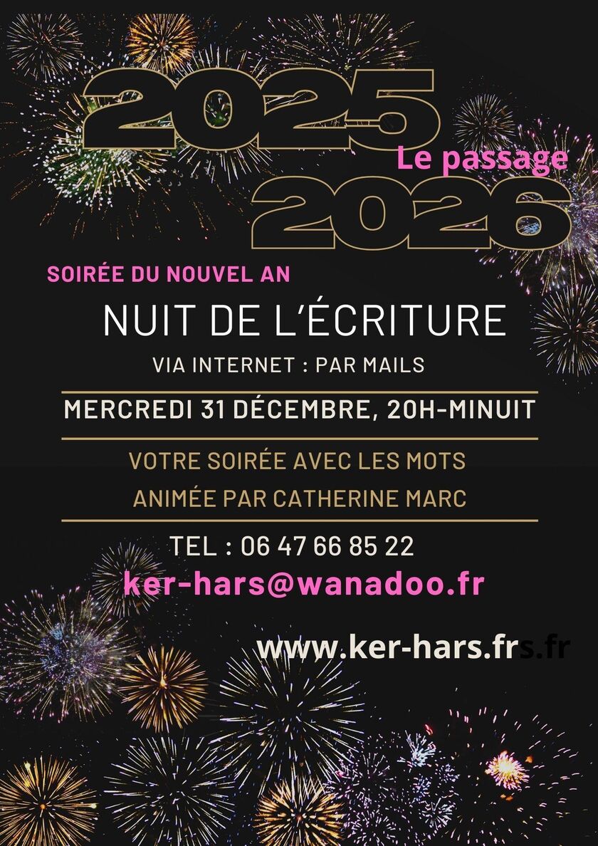 5e édition de l'écriture de la nuit, en ligne, pour le passage en 2026. Atelier d'écriture animé par Catherine Marc via internet. Les consignes sont expédiées par mails. Inscription possible dès maintenant.