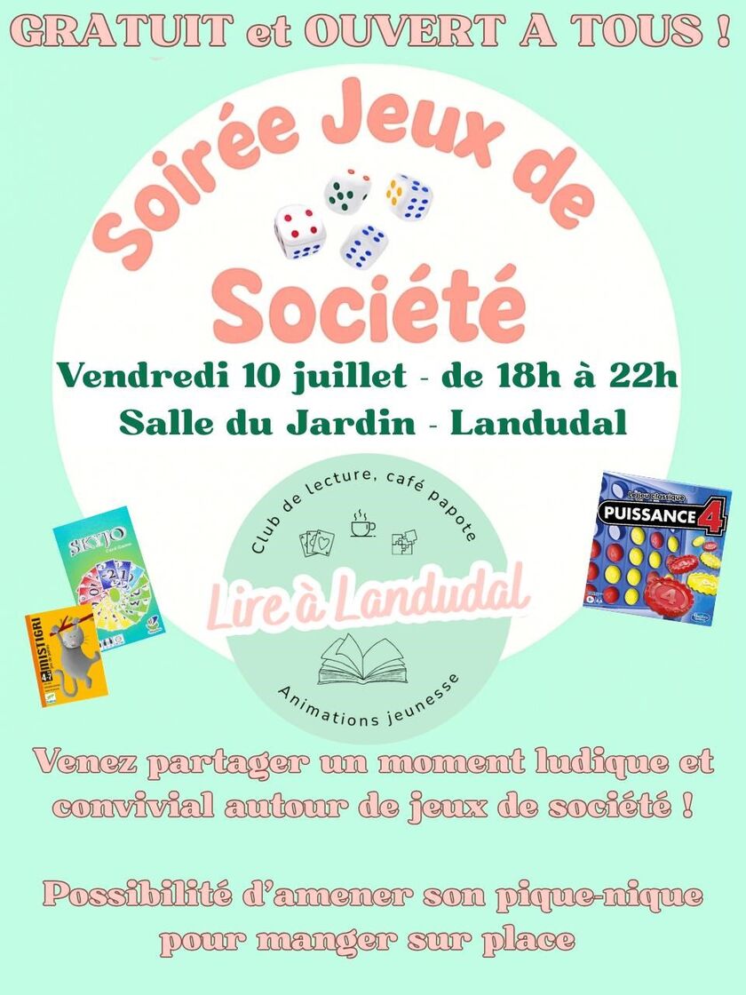 L'association Lire à Landudal organise une soirée jeux de société. Envie de jouer à un jeu ? Vous trouverez des jeux sur place ou amenez-les et trouver des joueurs pour faire une partie ensemble. Ouvert à tous. Possibilité d'amener son pique-nique pour manger sur place.