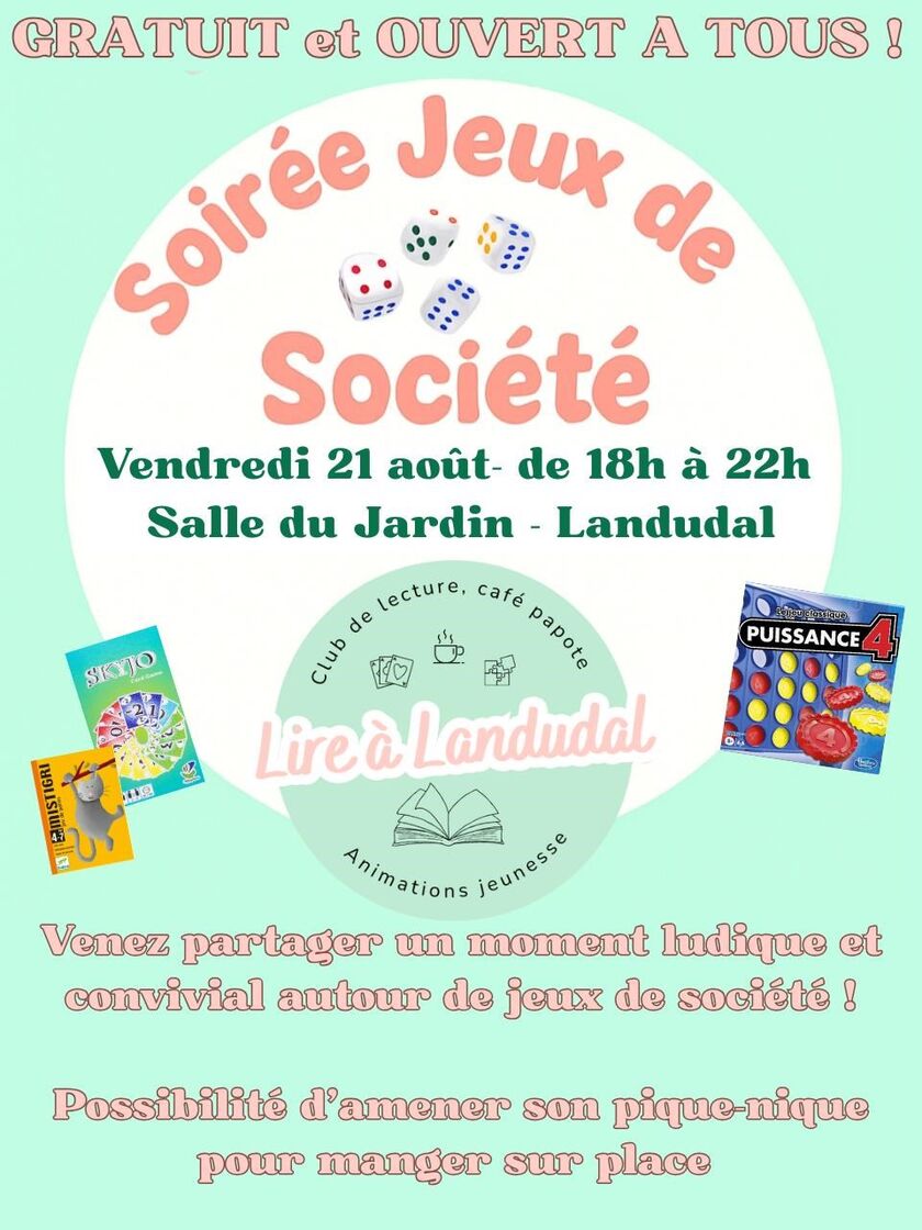 L'association Lire à Landudal organise une soirée jeux de société. Envie de jouer à un jeu ? Vous trouverez des jeux sur place ou amenez-les et trouver des joueurs pour faire une partie ensemble. Ouvert à tous. Possibilité d'amener son pique-nique pour manger sur place.