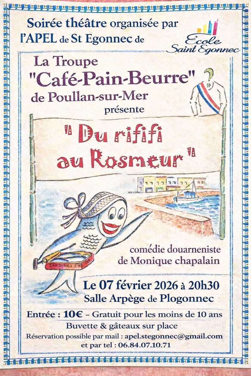 Venez découvrir la pièce de théatre de la troupe Café-Pain-Beurre, « du Rififi au Rosmeur ». Début de la pièce à 20 h 30. Ouverture des portes à partir de 18 h 30. Vente de billets prévu le 31 janvier au Super U de Plogonnec de 9 h à 12 h.